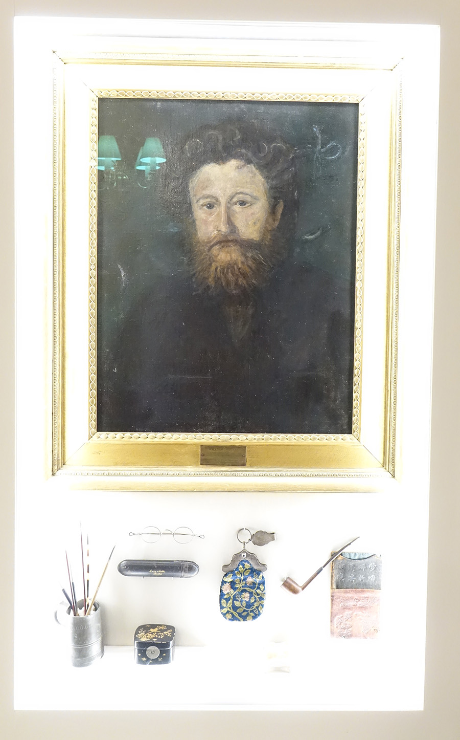 A portrait of William Morris displayed in Exeter College alongside some of his personal effects