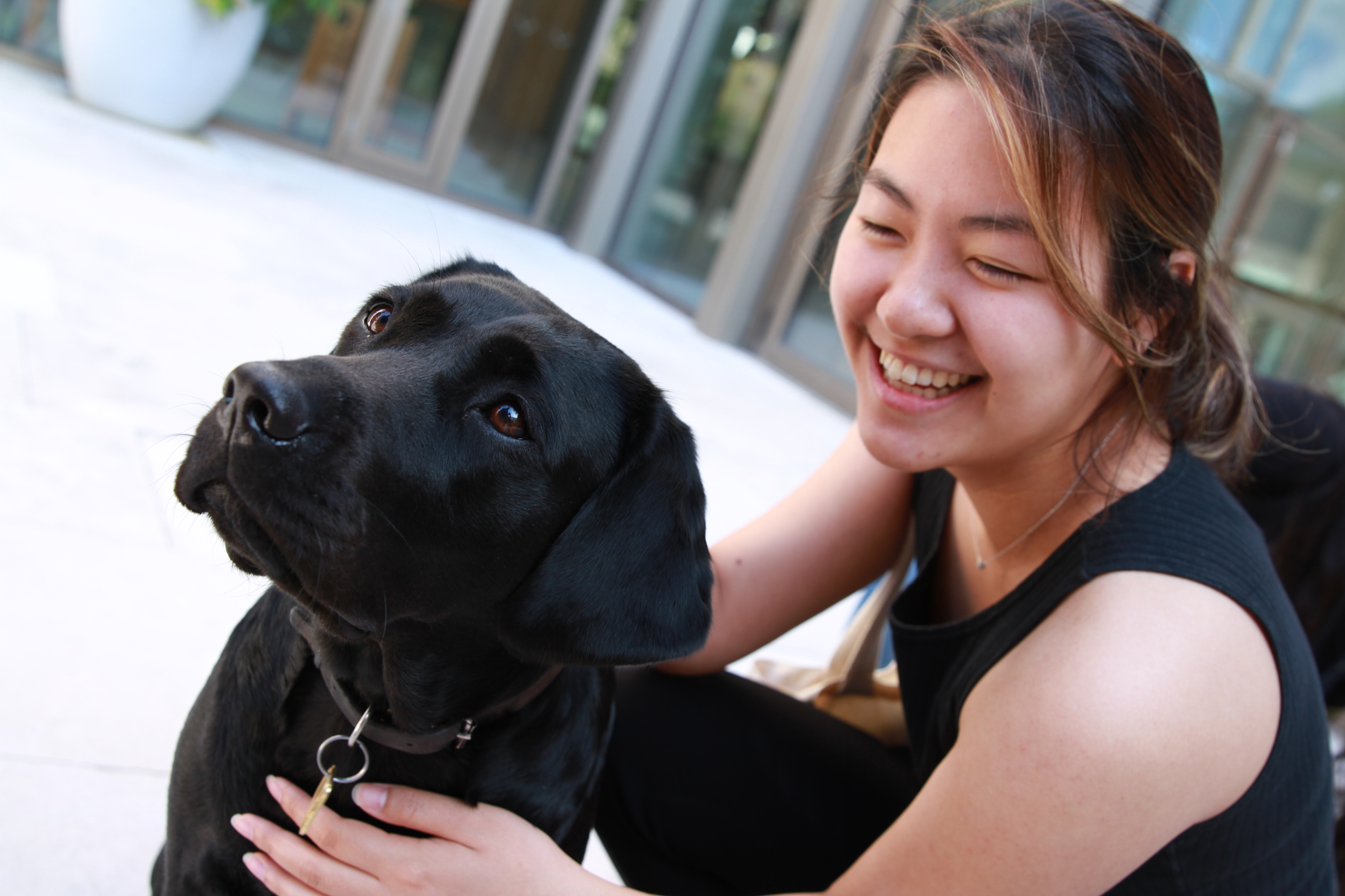 Exeter College Summer Programme Student smiling with a black Labrador