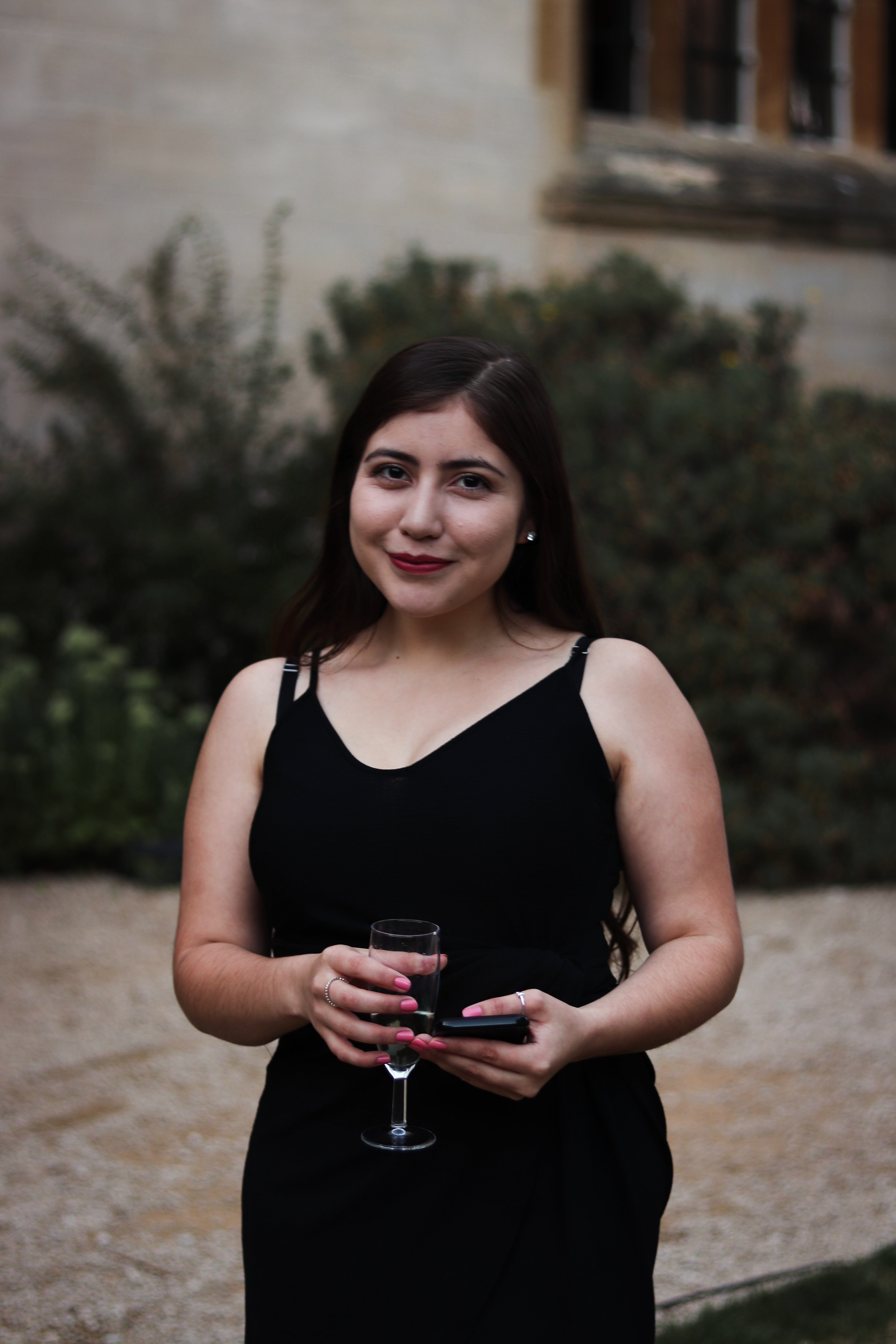 student at a formal in Front Quad smiling
